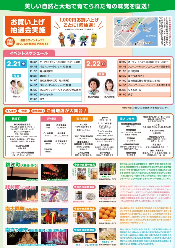 大隅半島と薩摩半島の隅くじら(すみっこ)にある1市3町(南さつま市、南大隅町、錦江町、肝付町)の特産品が一堂に集まるイベントが鹿児島市の『かんまちあ』にて開催されます。入場は無料で、各市町自慢の野菜や加工品等の特産品がたくさんありますのでお気軽にお立ち寄りください。
