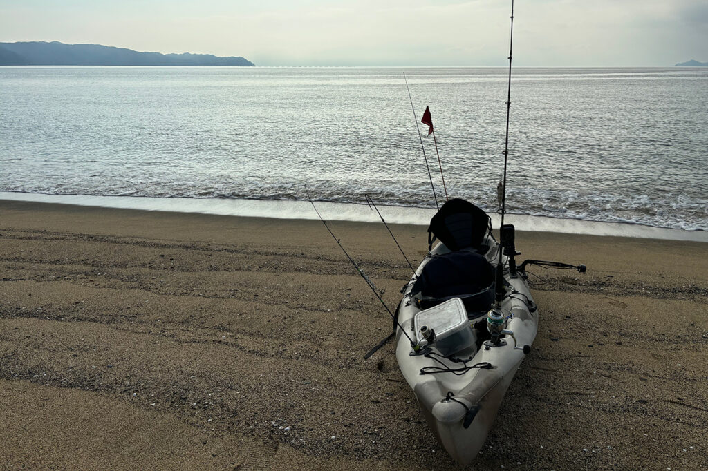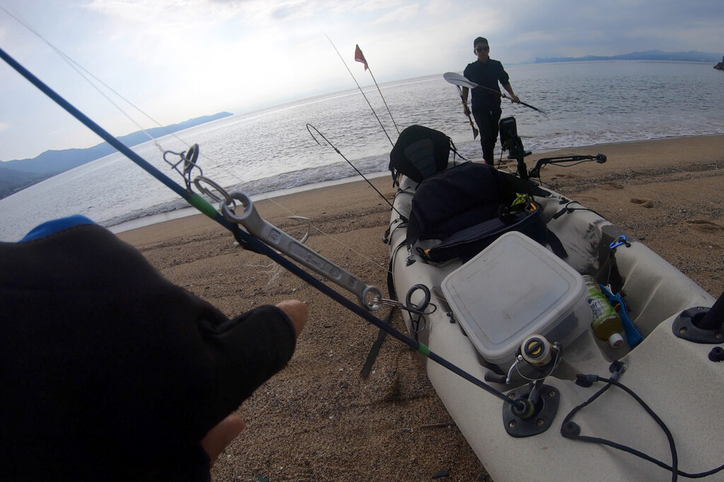 二人乗り専用カヤックにフラッグや魚探などをセッティングし、ライフジャケット・タックルを手に、心躍らせながら砂浜から出艇します。