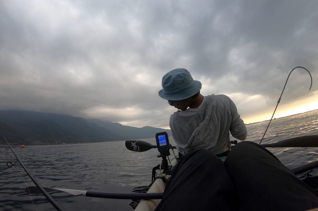 その後、魚探に映るベイトの反応も、アタリも無くなり、いよいよ本命である「かけ上がりのポイント」までパドリングして移動します。