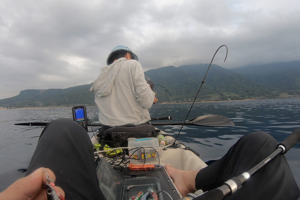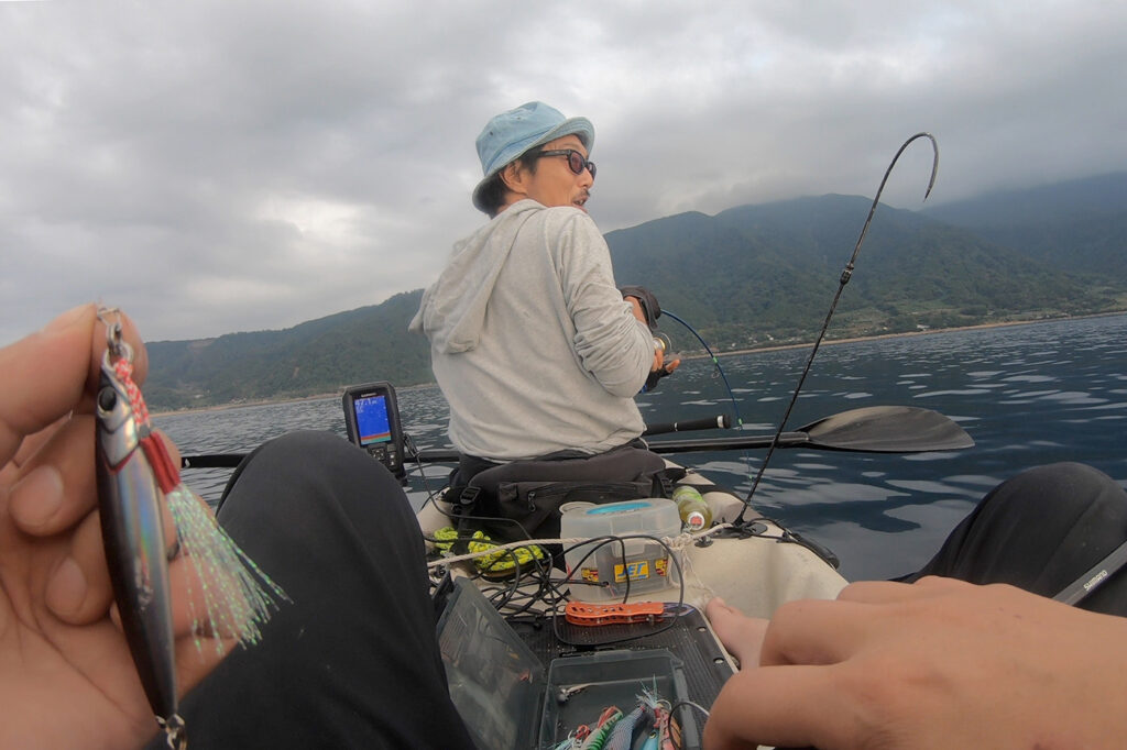 【15:00】パドリング中、魚探のフィッシュアラームが鳴り響く!ジグを投入!