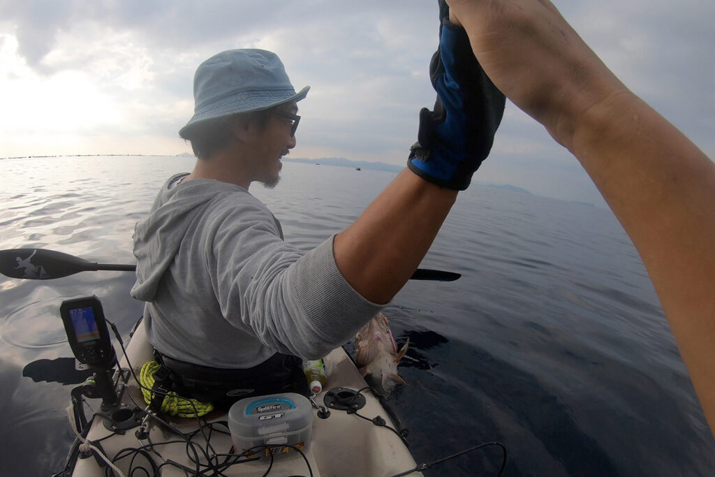 想定外の大物高級魚が釣れて、同行者と歓喜のハイタッチ!