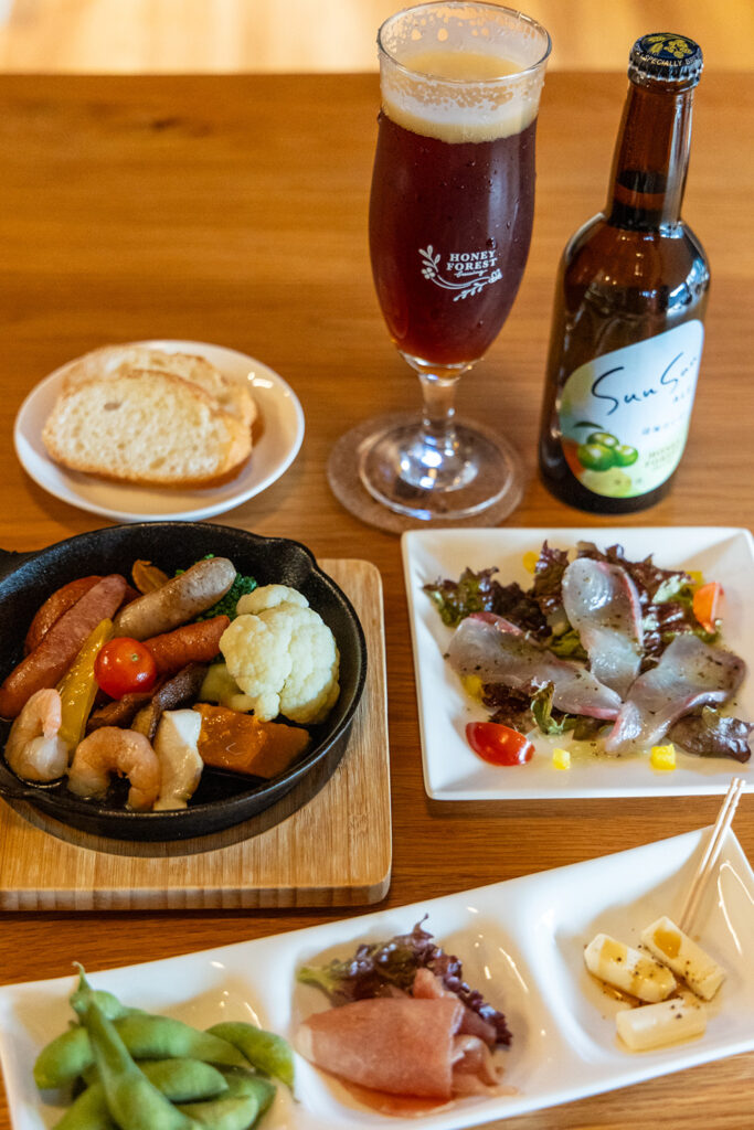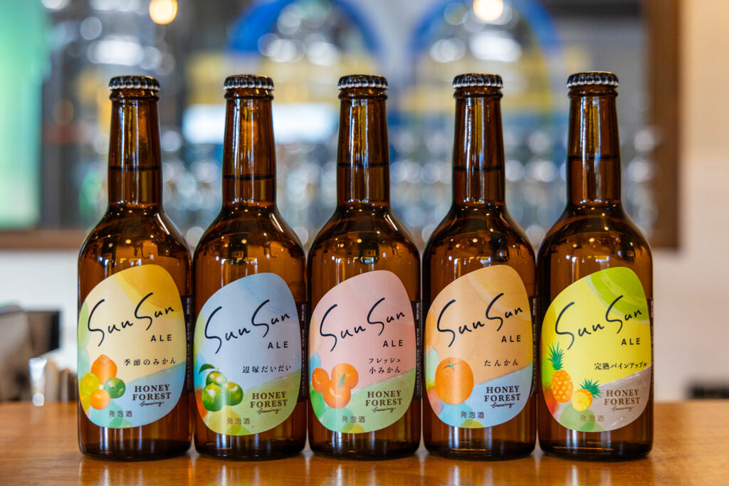 夜だって地元グルメを満喫したい!ということで、根占にある本土最南端のクラフトビール工房「Honey Forest Brewing」へ。南大隅町在住のブルワー(ビール職人)相羽ゆかさんが手がけるのはフルーツビール「Sun Sun ALE(サンサンエール)」。南大隅町産のフルーツとご主人が自家養蜂でつくるハチミツを使った爽快でフルーティな味わいが魅力だ。